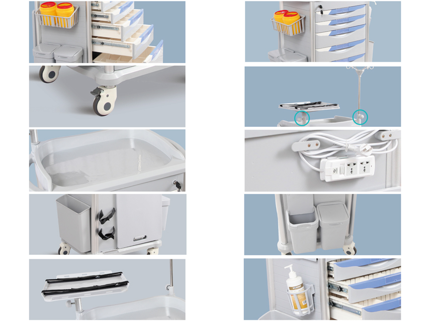 - Included accessories : jib crane serum mobile, plate defibrillator, support for oxygen bottle, container, plan of work extracting, board RCP, dividers, support gel for hands, power outlet, 2 containers needle 2L, lock core, 2 bins ABS with lid.