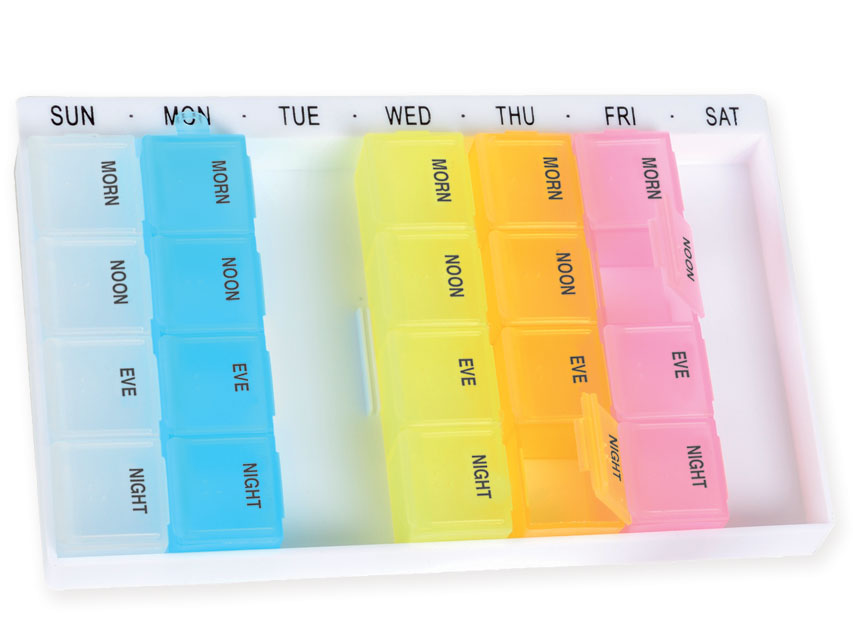 - 7 small removable boxes with 4 compartments (morning, noon, evening, night)
