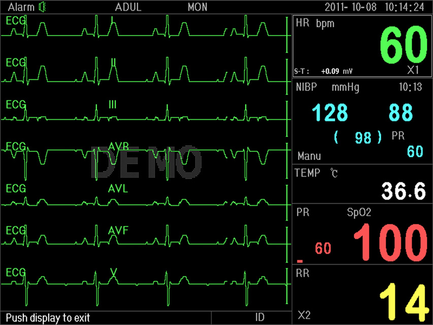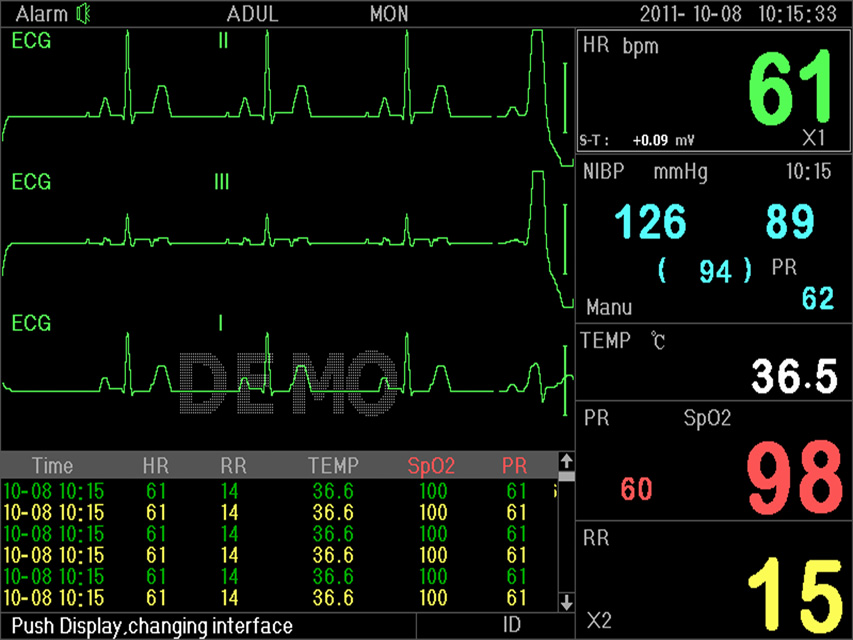 - Monitoring parameters : ECG, RESP, SpO2, NIBP, 2-TEMP, PR.