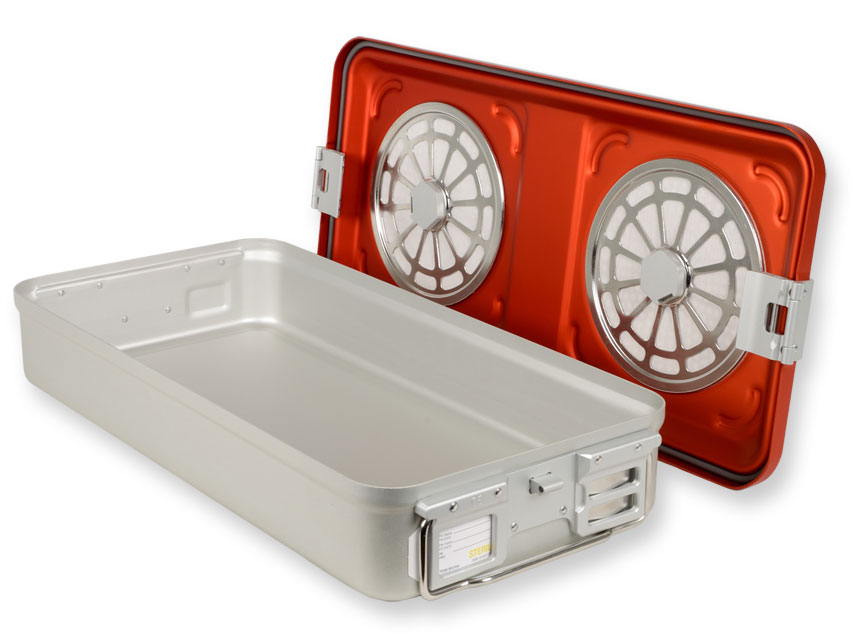 The container with filter large 100 mm pitch is designed to meet the demands of medical environments. Its use in the operating rooms and laboratories ensures a effective sterilization of surgical instruments.