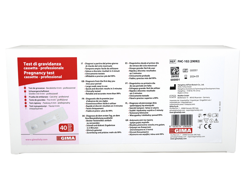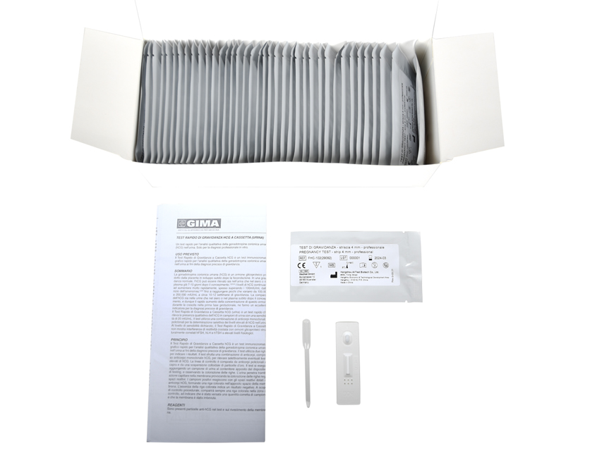 The pregnancy test GIMA, in the form of a cassette tape, is designed for professional use and allows a rapid and accurate detection of pregnancy. With a sensitivity of 20 mlU/ml, it is ideal for clinics and health professionals interested in providing a reliable service to their patients.