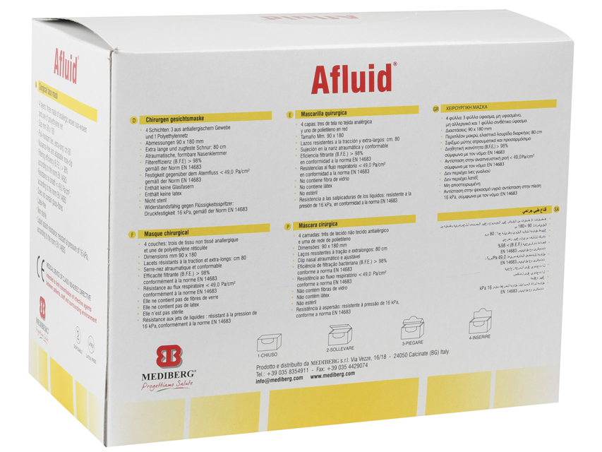 Le masque chirurgical AFLUID® est conçu pour offrir une protection maximale lors de procédures médicales. Fabriqué en Italie, il répond aux normes strictes de sécurité, garantissant une barrière efficace contre les agents pathogènes.