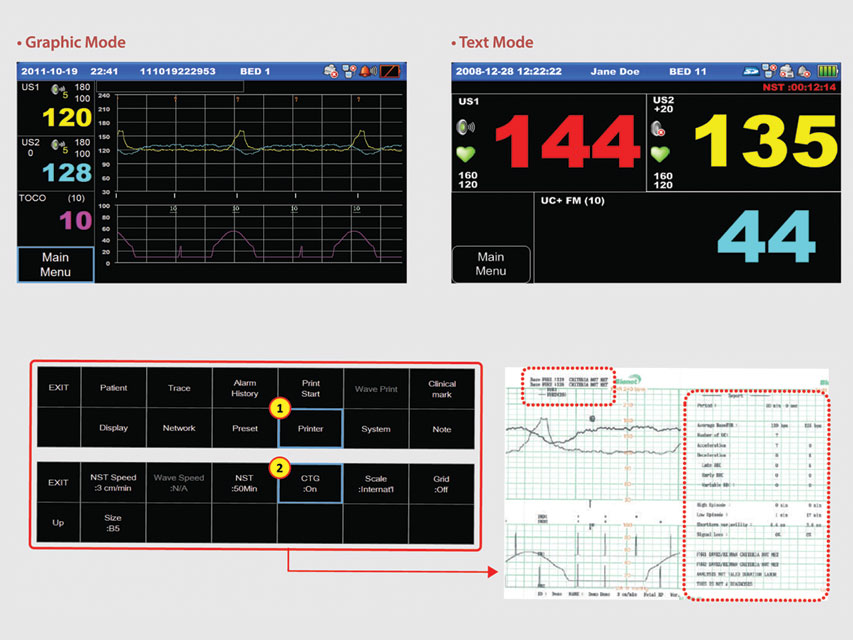 - Impression des rapports CTG compatibles avec des feuilles standard et A4.