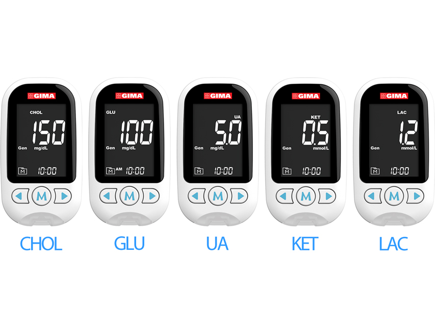 - Mesures de 6 paramètres : glucose, cétones, lactate, cholestérol, acide urique et hémoglobine.